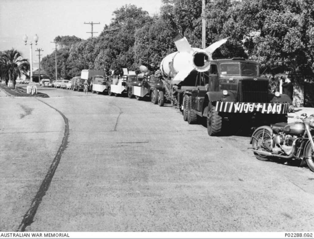 A convoy of RAAF trucks, transporting examples of enemy and allied rockets parked in Hornsby street Sept 1957.